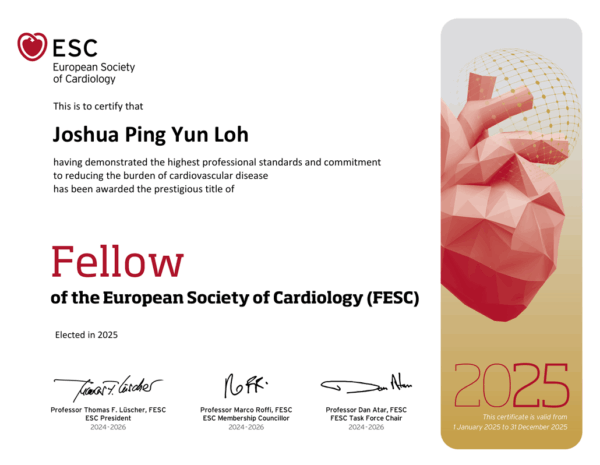 We are proud to announce that Dr Joshua Loh, Senior Consultant Cardiologist at Capital Heart Centre, has been conferred the title of Fellow of the European Society of Cardiology (FESC) during the ESC Congress 2025, held in conjunction with the World Congress of Cardiology in Madrid, Spain, from 29 August to 1 September 2025.